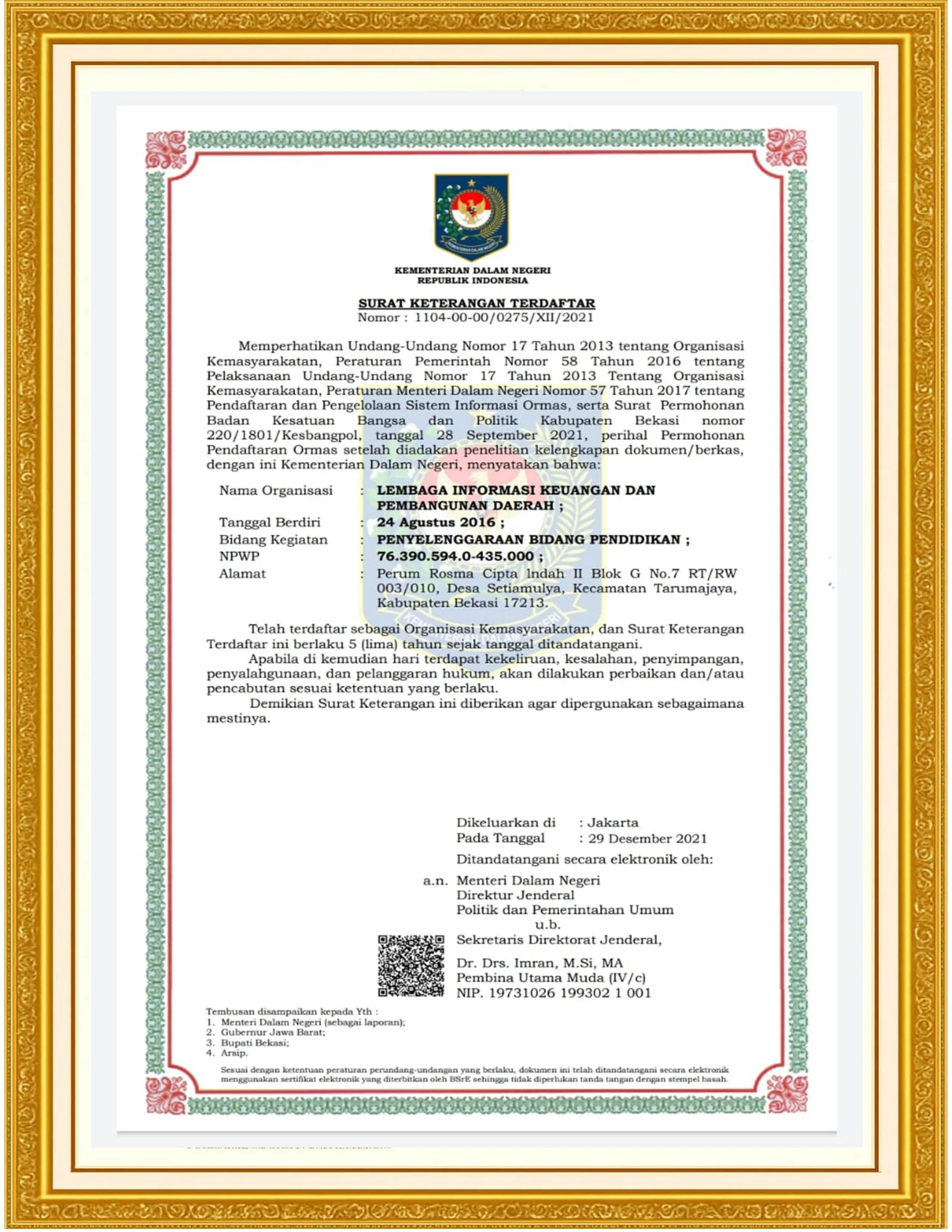 Sebagai lembaga yang mengedepankan akuntabilitas dan kepatuhan hukum, LINKPEMDA memiliki legalitas resmi yang dapat dipertanggungjawabkan, antara lain: